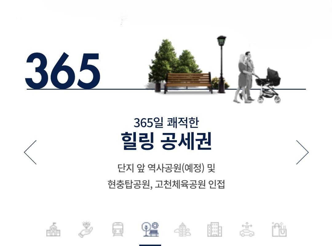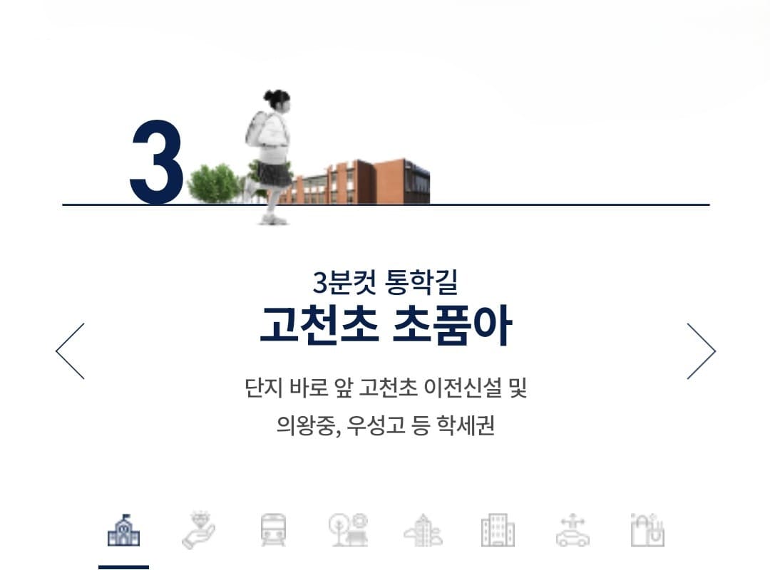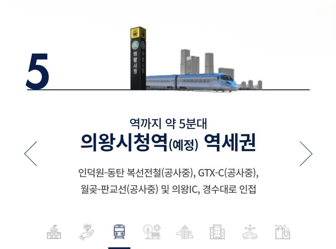 단지 인근에는 의왕시청을 비롯해 소방서, 경찰서, 보건소 등 다양한 행정기관들이 자리하고 있습니다. 또 의왕시티병원과 함께 이마트, 주민센터 등이 가까워 생활편의시설을 편리하게 이용할 수 있습니다. 여기에 단지 앞 역사공원이 조성될 예정이며, 현충탑공원 고천체육공원 등도 인근에 자리하고 있습니다.